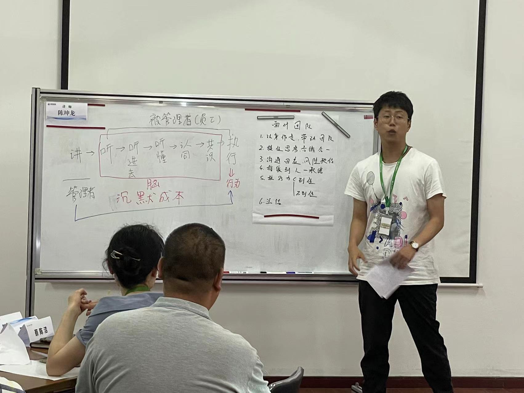 学员们围绕着“管理”以小组为单位制作海报并上台汇报,结合老师的讲解,从而加深对于管理的理解。